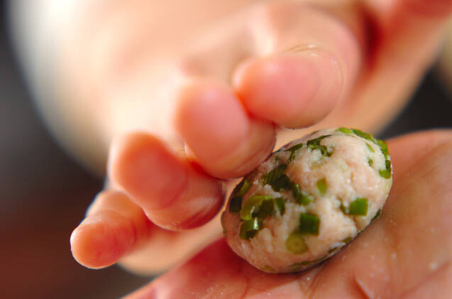 鶏ひき肉のボウルにおから、ネギ、ショウガを入れ、手でよく混ぜ合わせ、3cmくらいの大きさに丸め、形を整える。