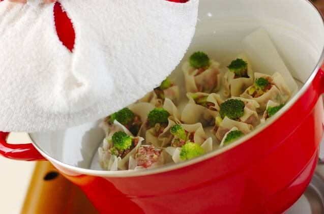 オーブンシートをしいた蒸し器に、(3)を隣とくっつかないように並べる。湯気の上がった蒸し器に入れ、蓋をして8~10分蒸す。器に盛り、合わせた<つけダレ>の材料と練りからしを添える。