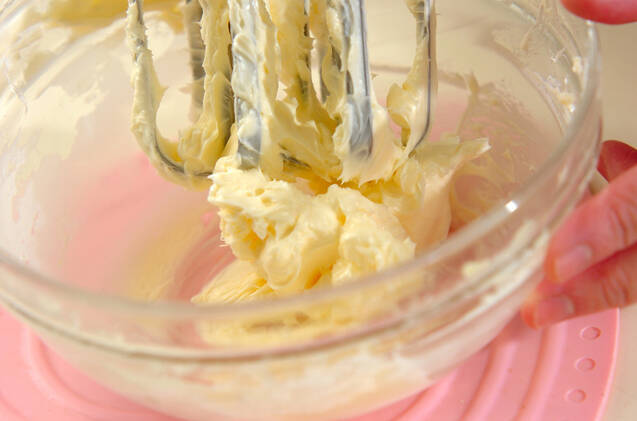 ボウルに無塩バターを入れ、クリーム状になるまでハンドミキサーで混ぜる。