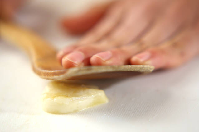 ニンニクは縦半分に切って芽を取り、たたきつぶす。