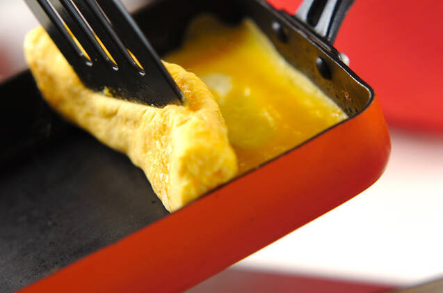 <卵焼き>の材料を混ぜ合わせる。卵焼き器を中火にかけ、薄く分量外のサラダ油をひき、卵液の1/4量を入れて半熟になったら向こう側に寄せる。空いた所にサラダ油をひき、残りの卵液の1/3量を流し入れ、寄せた卵の下にも卵液を流し、手前に巻く。同様に2回繰り返す。巻きすで巻いて形を整え、冷めたら縦半分に切る。