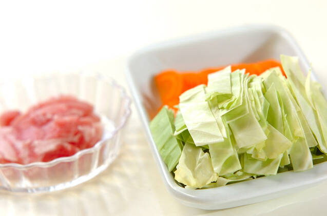 キャベツはザク切りにする。ニンジンは皮をむいて薄い半月切りにする。豚肉は細切りにする。