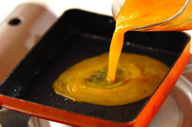 卵焼き器を中火で熱してサラダ油を薄くひき、<卵液>の1/3量を流し込んで全体に広げる。