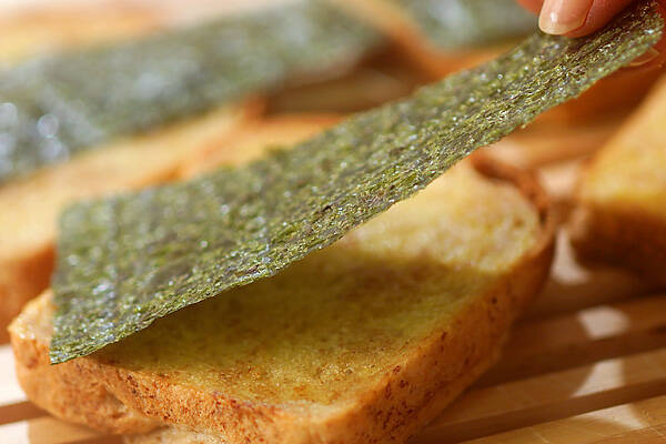 パンはトースターで軽く焼き、片面に<からしバター>をぬり、海苔をのせる。