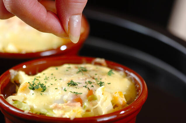 コショウを振りピザ用チーズをのせ、230℃に予熱しておいたオーブンで5~6分チーズに焼き色がつくまで焼き、ドライパセリを振りかける。