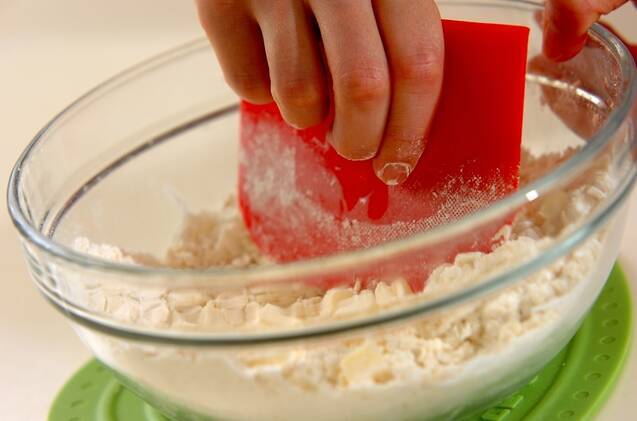 1cm角に切ったバターを加えてカードで切るように混ぜ合わせ、チョコチップを加え、サックリ混ぜたら手でひとまとめにする。