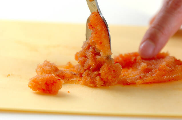 明太子は切り込みを入れて、スプーン等で中身をしごき出す。
