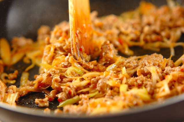 (1)のフライパンにサラダ油を熱し、白ネギ、ショウガ、ニンニク、豆板醤を加え、香りがたったら豚ひき肉を加え、肉がポロポロになるまで炒め合わせる。