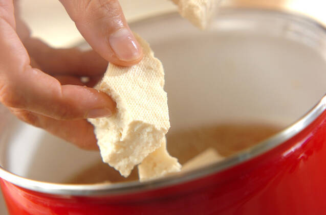 鍋に<調味料>の材料とチリメンジャコを入れて火にかけ、煮たったら中火にして木綿豆腐を大きめにちぎりながら加え、1~2分煮る。
