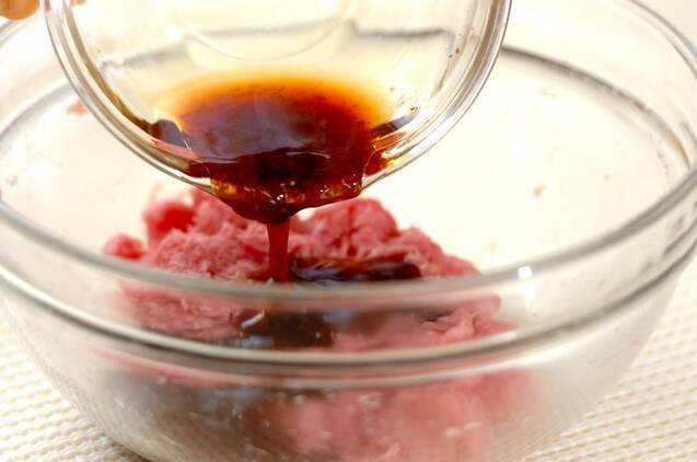 (1)に<合わせ調味料>の材料を入れ、さらによく混ぜる。