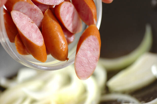 分量外の2000mlの熱湯に塩を入れ、スパゲティを加える。袋の指定時間より1分短い時間ゆでる。ゆでている間にソースを作る。フライパンにオリーブ油、ニンニク、玉ネギ、ソーセージを入れ、中火で玉ネギがしんなりするまで炒める。