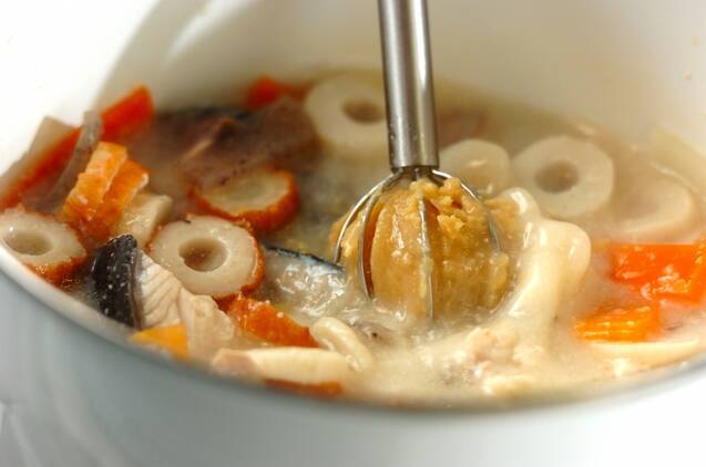 酒粕、白みそを溶き入れる。ネギを加えてひと煮たちさせ、薄口しょうゆと塩で味を調え、器によそう。