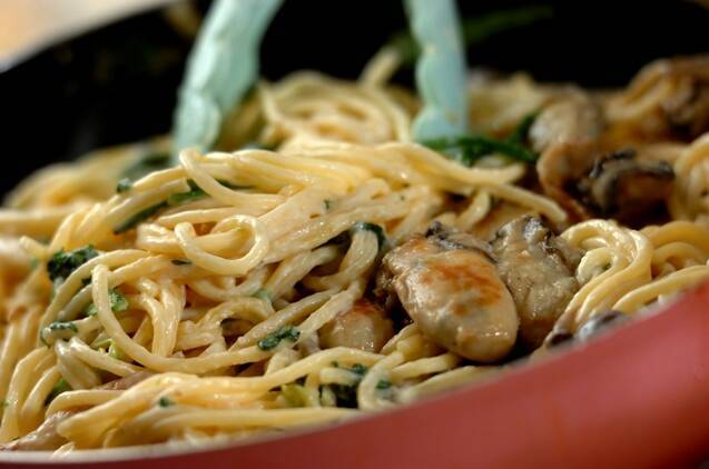 ゆで上がったスパゲティー、(2)の生カキを加えて混ぜ合わせ、器に盛る。