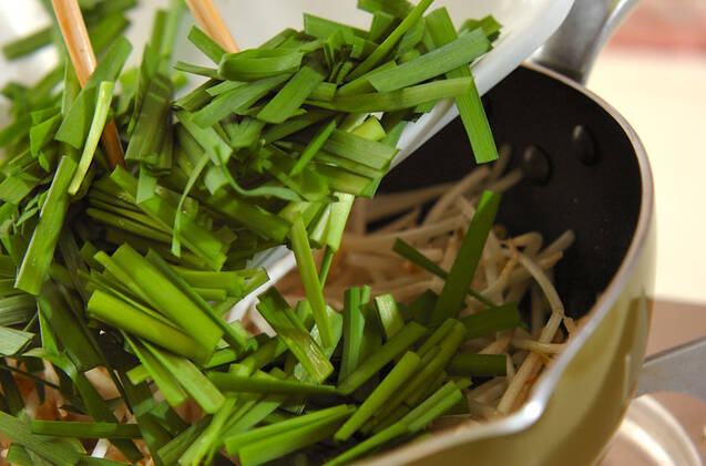 フライパンにゴマ油を強火で熱してモヤシを炒め、全体に油がまわったらニラを加えて炒め合わせる。