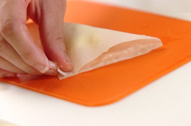 春巻きの皮を4等分に切り、(1)をのせて三角に折り、混ぜ合わせた<のり>で端を止める。