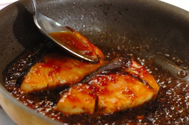 <合わせ調味料>の材料を入れて強火にし、ブリにからめながら照りをつける。