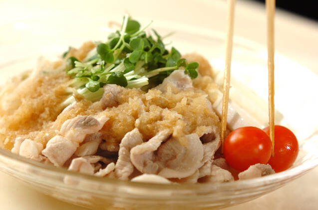 器に素麺を盛り、豚肉、大和芋、貝われ菜、ミョウガ、モヤシを盛り合わせ、<合わせダレ>をかけてプチトマトを添える。