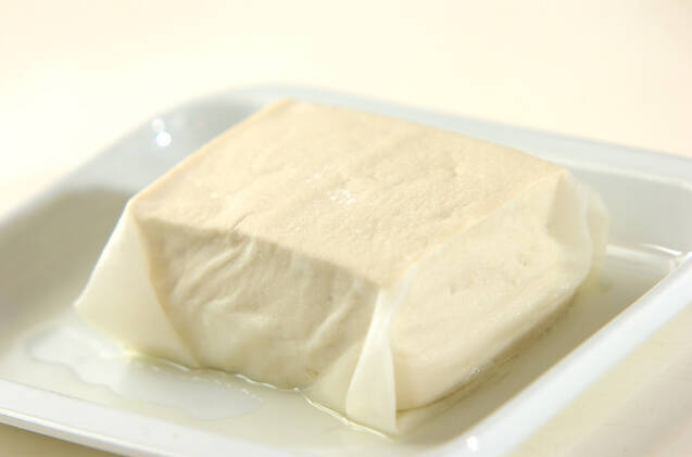 木綿豆腐はキッチンペーパーに包み、耐熱皿にのせて電子レンジで2分加熱する。横半分に切り、さらに幅1cmに切る。電子レンジは600Wを使用しています。