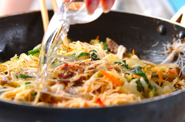 牛肉の色が変わったら、ビーフンを加えて炒め合わせ、豆板醤、XO醤を加える。全体にサックリからまったら、2の野菜を戻し、<調味料>を加えて味を調え、全体に炒め合わせる。