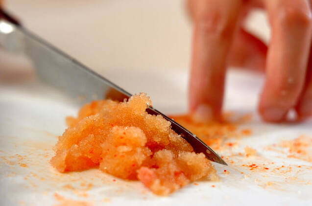 明太子は薄皮に切り込みを入れて中身をこそげ出し、ボウルに入れて残りの<明太ダレ>の材料も入れ混ぜ合わせる。