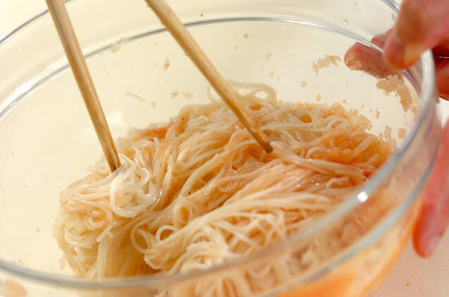 素麺を<明太ダレ>のボウルに入れてよく混ぜ合わせ、器に盛り香菜を散らす。