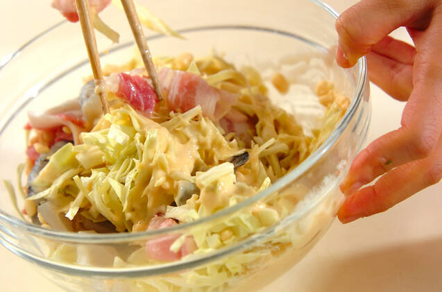 <お好み焼き>を焼く。ボウルにキャベツ、半量強の<生地>、天かすの半量をよく混ぜ合わせる。お好みの具(豚バラ肉、牛すじ肉、イカ、エビ、プロセスチーズなど)を加えて混ぜ合わせる。サラダ油を薄くひいたホットプレートに流し広げ、丸く整えて干し桜エビを散らす。