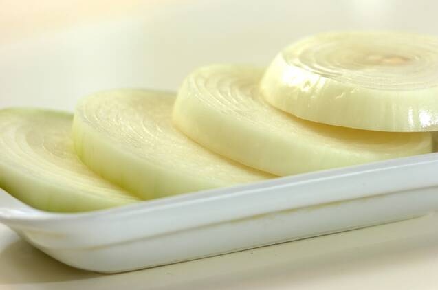 玉ネギは6等分の輪切りにする。両端の2個は<オニオンマリネ>用にすりおろす。