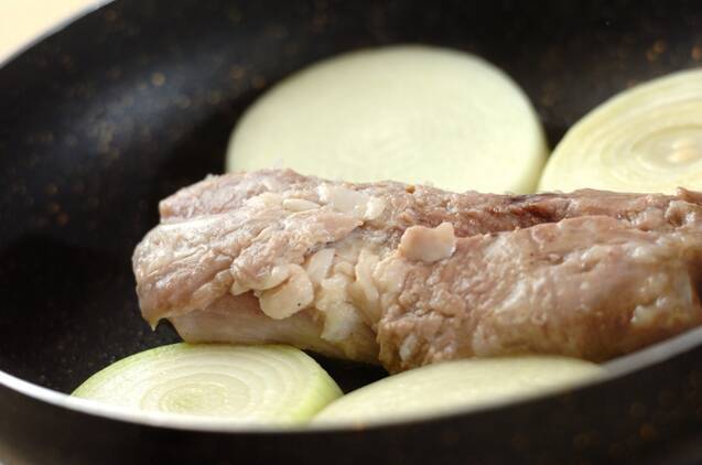 (1)から、まわりについたマリネ液を落とし、豚ヒレ肉を取り出す。フライパンにオリーブ油を入れ、豚ヒレ肉と輪切りの玉ネギを置いて中火にかける。