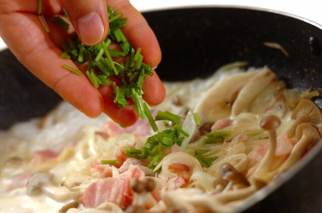 しんなりしたら生クリームとパクチーの茎を加え、煮たったら火を弱めて塩で味を調え、ゆで上がったスパゲティーを加えてからめる。