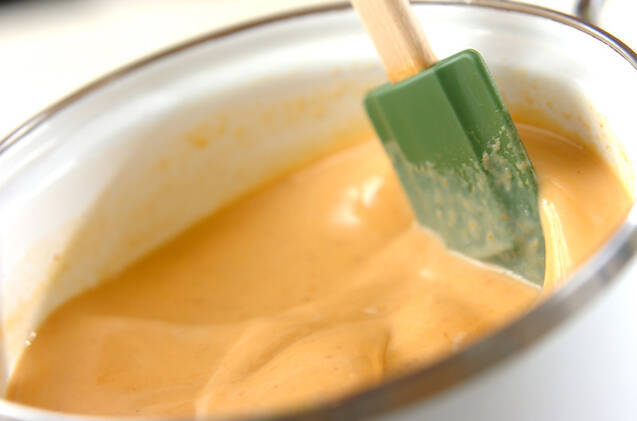 鍋にカボチャと牛乳、砂糖を加えて弱めの中火にかけ、沸騰させないように混ぜ合わせ、砂糖を溶かす。