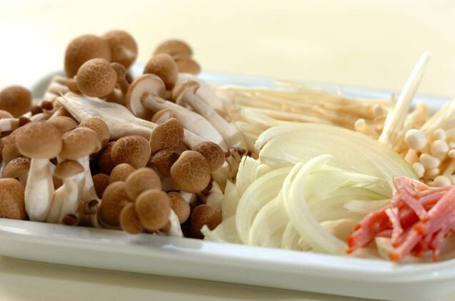 シメジ、エノキは石づきを取って小房に分け、エノキは長さを半分に切る。玉ネギは縦に薄切りにする。ベーコンは細切りにする。