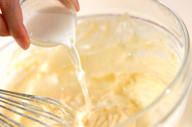 合わせたバターを泡立て器でクリーム状に混ぜ合わせ、グラニュー糖を加えてすりつぶすようにふんわりするまでよく混ぜる。卵を2~3回に分けて加えながらよく混ぜ合わせ、牛乳も混ぜ合わせる。分離しそうな場合は振るった粉を少し加えて下さい。