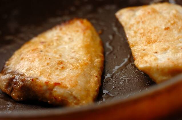 カジキにコショウを振り、小麦粉を薄くまぶす。フライパンにバターを熱し、カジキの両面を弱めの中火で各1~2分ずつ焼く。