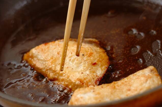 レモン汁としょうゆを加えてからめ、カジキを取り出して器に盛る。フライパンに残った汁があればカジキにかける。