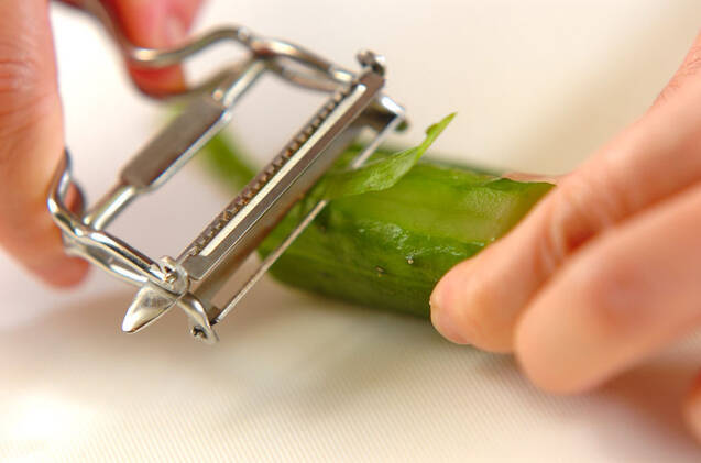 キュウリは縦じまにピーラーで皮をむき、薄い輪切りにして分量外の塩でもみ、しんなりしたら水気を絞る。