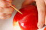 焼きりんごを作る。りんごは2つ割にし、芯をスプーンで抜く。皮の上から、竹串で浅く穴をあける
