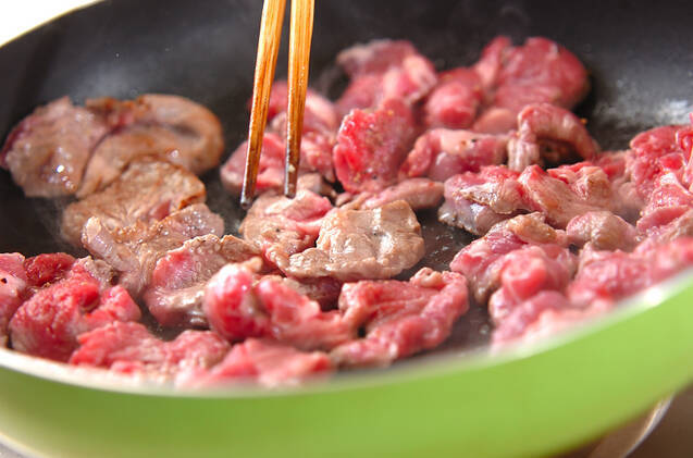 フライパンにサラダ油大さじ1/2を熱し、ラム肉を炒めていったん取り出す。