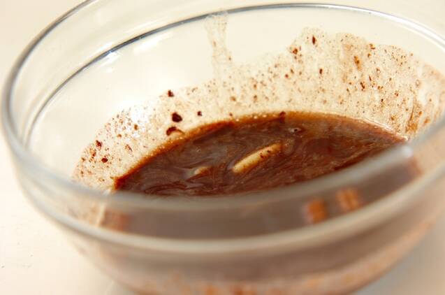 スイートチョコレートは細かく刻んで、無塩バターと牛乳を加えて電子レンジで約30秒加熱し、よく混ぜて溶かしておく。