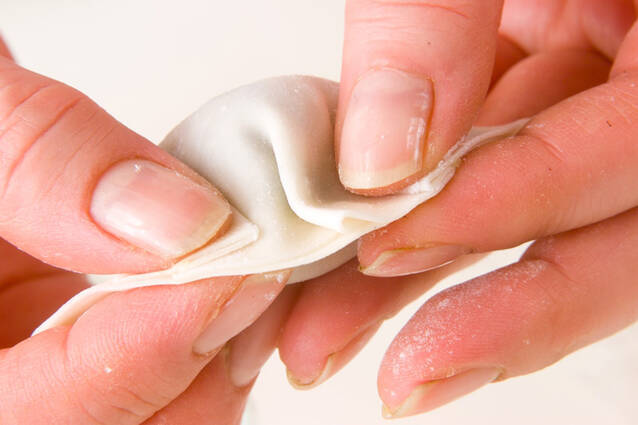 手のひらに餃子の皮をのせ、<種>をのせ、ひだをとりながら形を整え、包み込む。
