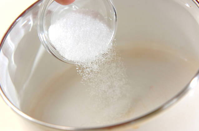 <シロップ>を作る。小鍋に水、グラニュー糖を入れて火にかける。グラニュー糖が溶けたら火から外す。粗熱が取れたらキルシュを加える。
