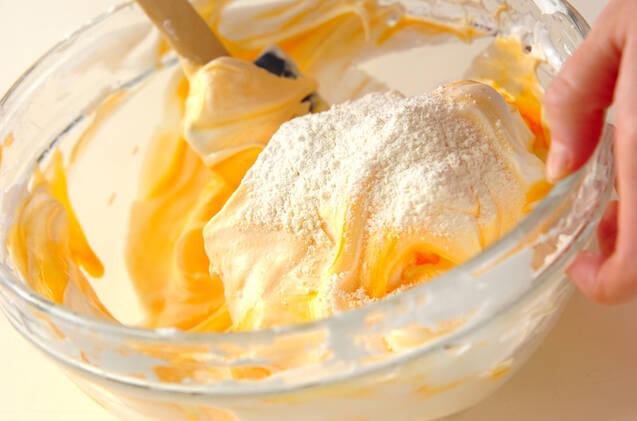 (1)に卵黄62gを加えて軽く混ぜ、さらに薄力粉を振るい入れ、ゴムベラで手早く混ぜる。