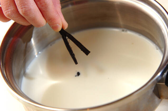 <クレーム・パティシエール>を作る。鍋に牛乳と裂いたバニラビーンズを入れ、火にかける。