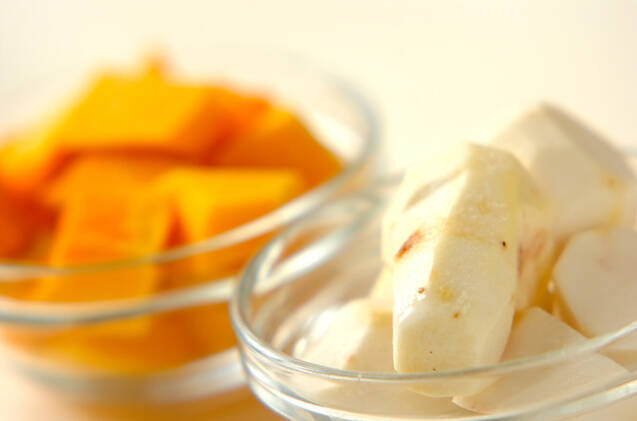 カボチャは種とワタを取り、皮を薄く削ぎ落とし、ひとくち大に切る。
