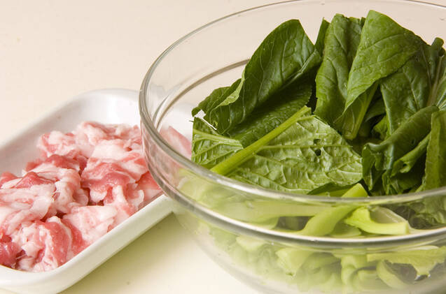 小松菜は水でよく洗い、根元を切り落とす。4cm長さに切り、水気を切っておく。豚バラ肉は2cm幅に切り、<下味>をからめておく。