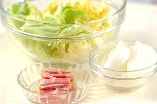 春キャベツはザク切りにして水洗いし、水気をしっかりきって耐熱ボウルに入れる。新玉ネギは4つのくし切りに、ベーコンは幅1cmに切ってキャベツと合わせる。