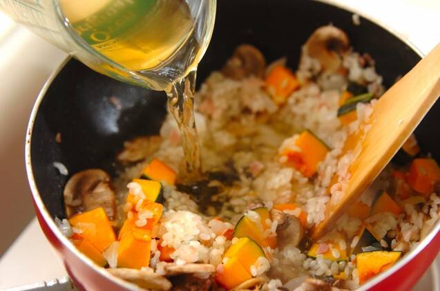 <スープ>を100mlずつ、2回に分けて加え、水気を飛ばしながら強火で炒める。 残りの<スープ>を入れ、フライパンに蓋をして弱めの中火で8~10分時々混ぜながら煮る。