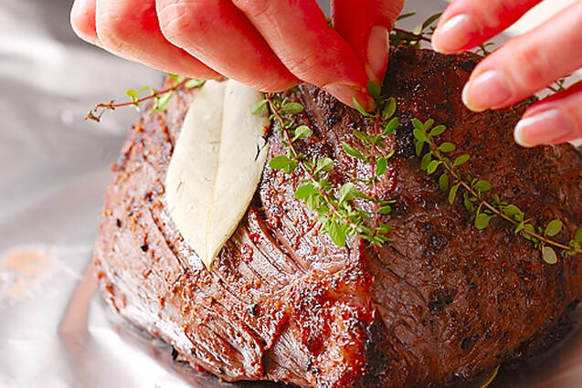 アルミホイルにローリエ、タイムの半量を並べて、(3)の牛もも塊肉をのせる。肉の周りにもタイムをのせ、アルミホイルで包み込む。肉汁が出ないように、アルミホイルで先ほど重ねた部分を下にして2重にしっかり包み込み、上下を返す。天板にのせ、160℃に予熱しておいたオーブンで30〜40分焼く。途中20分くらいで上下を返す。金串を牛もも肉の中央まで刺し、10~15秒おいて引き抜ぬいて唇にあて、温かいようなら出来ています。冷たいようならもう少し蒸し焼きにする。