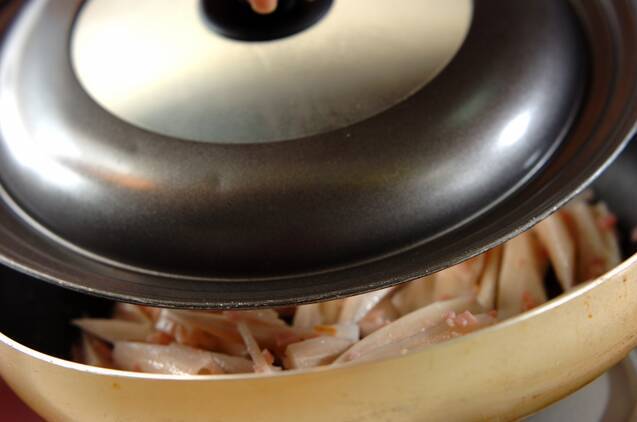 フライパンにサラダ油を入れ、中火にかける。レンコンとベーコンを入れ、油を馴染ませたら、蓋をして5分程度蒸し煮にする。