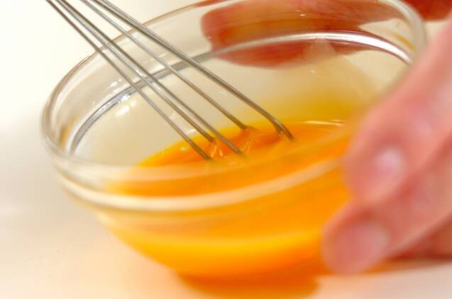 冷凍パイシートは常温で柔らかくする。卵黄に水を少し加え、混ぜ合わせる。オーブンを230℃に予熱する。
