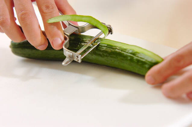 キュウリはヘタを切り落とし、ピーラーで3本筋状に皮をむき、3~4mm幅の輪切りにする。